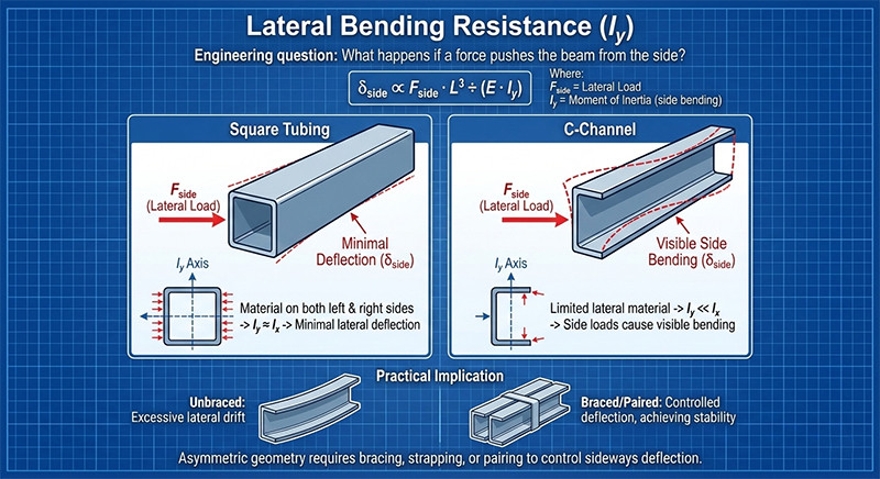 Square tubing: Material on both left and right sides → Iy ≈ Ix → minimal lateral deflection.