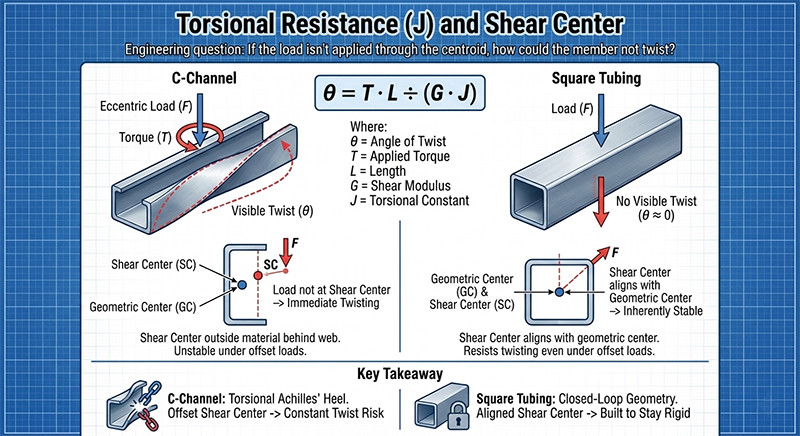 Torsional instability is the Achilles' heel of the C-channel. Its offset shear center makes twisting a constant risk, whereas square tubing’s closed-loop geometry is built to stay rigid.