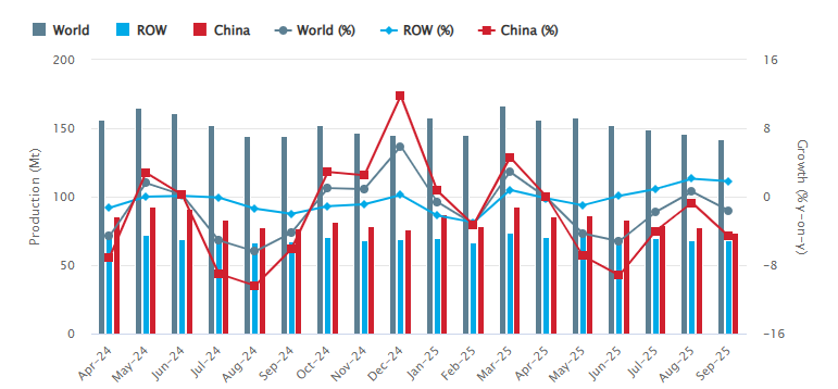 Global crude steel production for the 70 reporting countries reached 141.8 million tonnes in September 2025, representing a yearonyear decline of 1.6%.