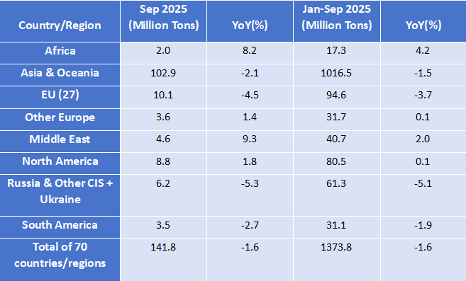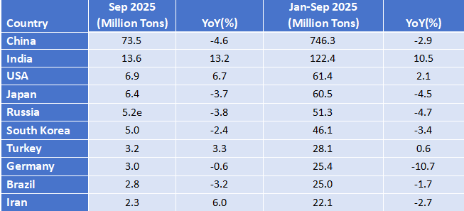 World Steel Association: Global Crude Steel Production in Sep 2025 Hits 141.8 Million Tons, Down 1.6% Year-on-Year